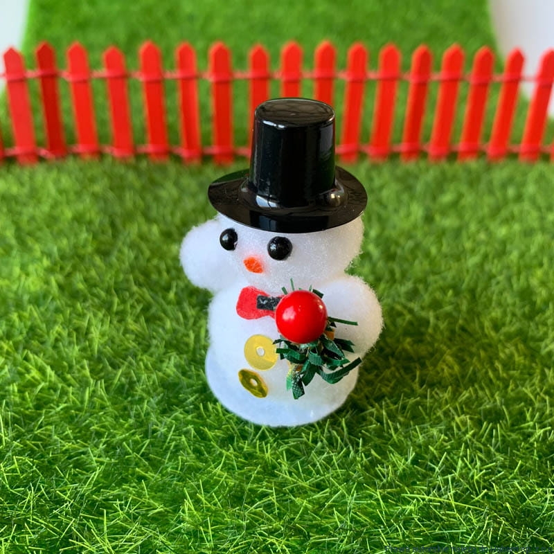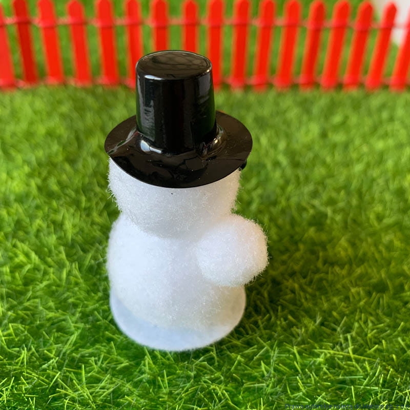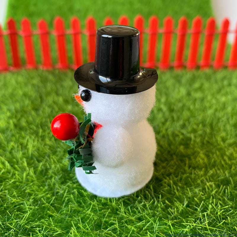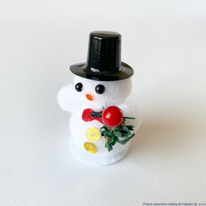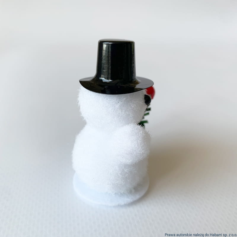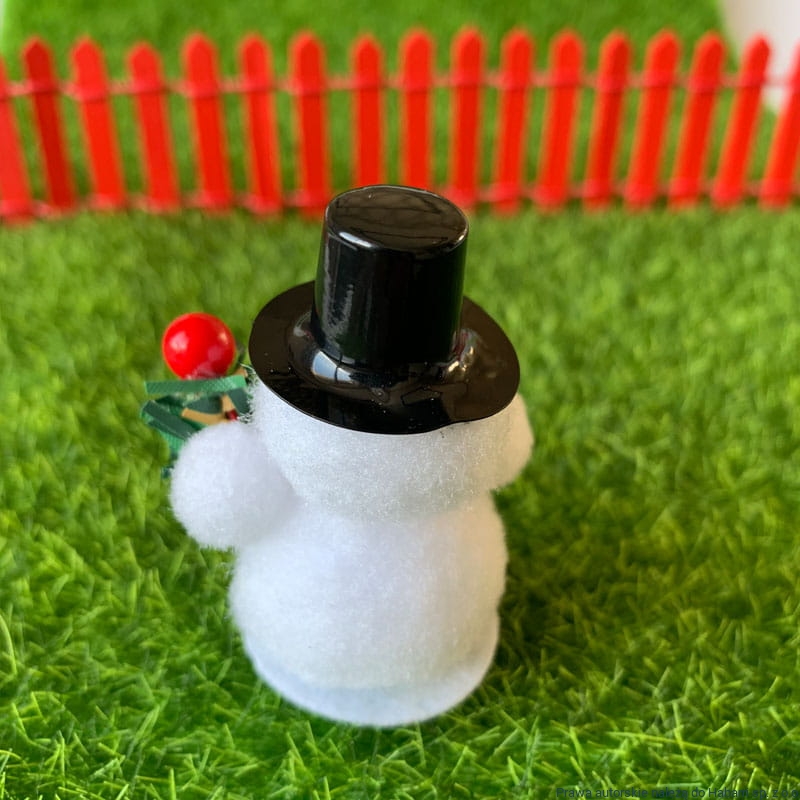 Biały bałwanek z czerwonym szalikiem oraz czarną czapką. Kapelusz plastikowy - czarny, gałązka choinkowa sztuczna - zielona.