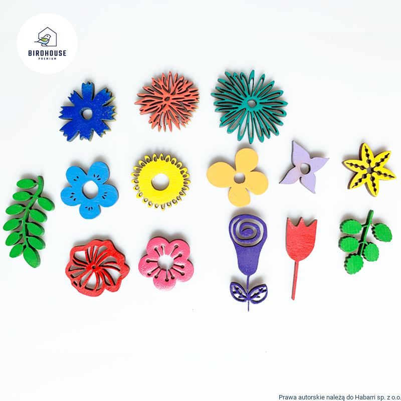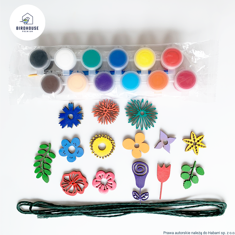 - zestaw do ozdobienia budki - farbki (12 kolorów), pędzelki (2 szt - wąska i szeroka końcówka), elementy drewniane - scrapki: kwiatuszki (12 szt, wymiary od 4 cm wys do 2 cm średnicy), gałązka (2 szt), sznurek bawełniany w kolorze ciemno-zielonym (2 szt x dł 1 m)