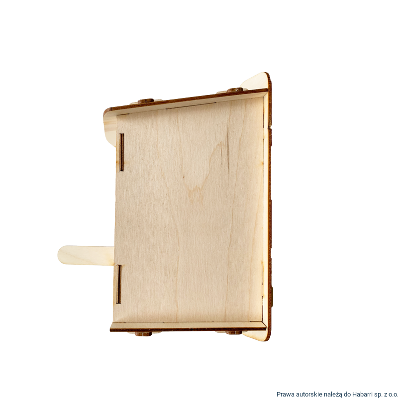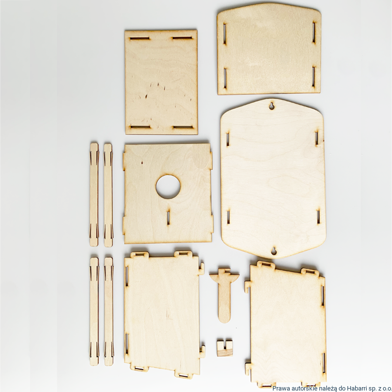 Elementy drewniane zestawu przyklejamy (klejem do drewna) na wybranej powierzchni domku.