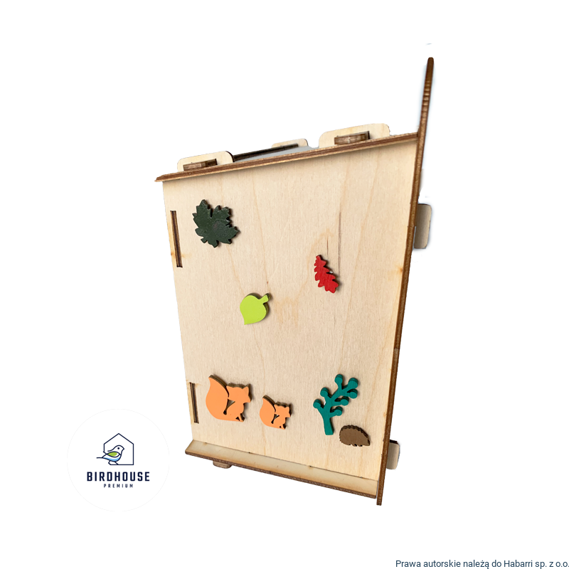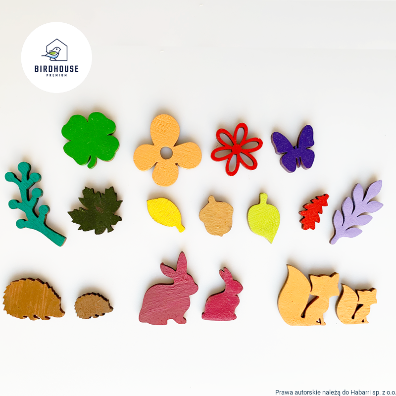 - zestaw do ozdobienia budki - farbki (12 kolorów), pędzelki (2 szt - wąska i szeroka końcówka), elementy drewniane - scrapki: zajączek, lisek, jeżyk (6 szt, wymiary od 3,5 cm do 1 cm wys), liście i gałązki (8 szt, wymiary od 4 cm do 1 cm wys), kwiatuszki - 2 szt, motylek - 1 szt, sznurek bawełniany w kolorze ciemno-zielonym (2 szt x dł 1 m)