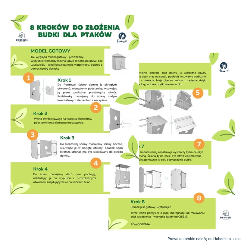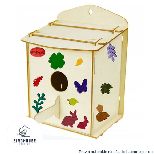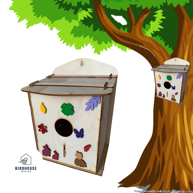 Zachęcamy każde dziecko do stworzenia swojej własnej koncepcji domku dla ptaków. Proponowany zestaw można wykorzystać na domek niemalowany (kolor jasno beżowy sklejki) lub dowolnie pomalowany.