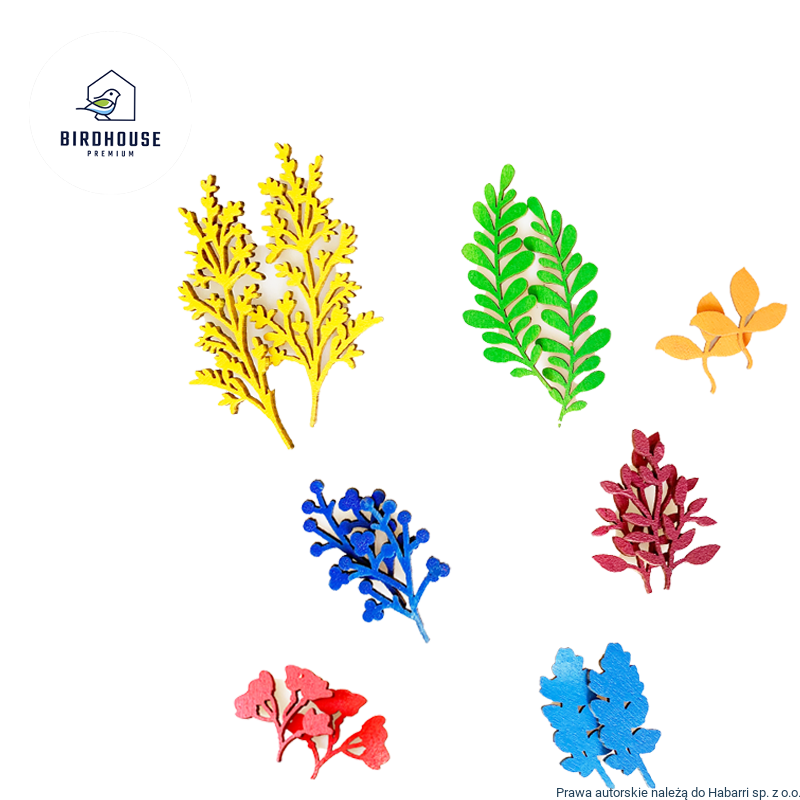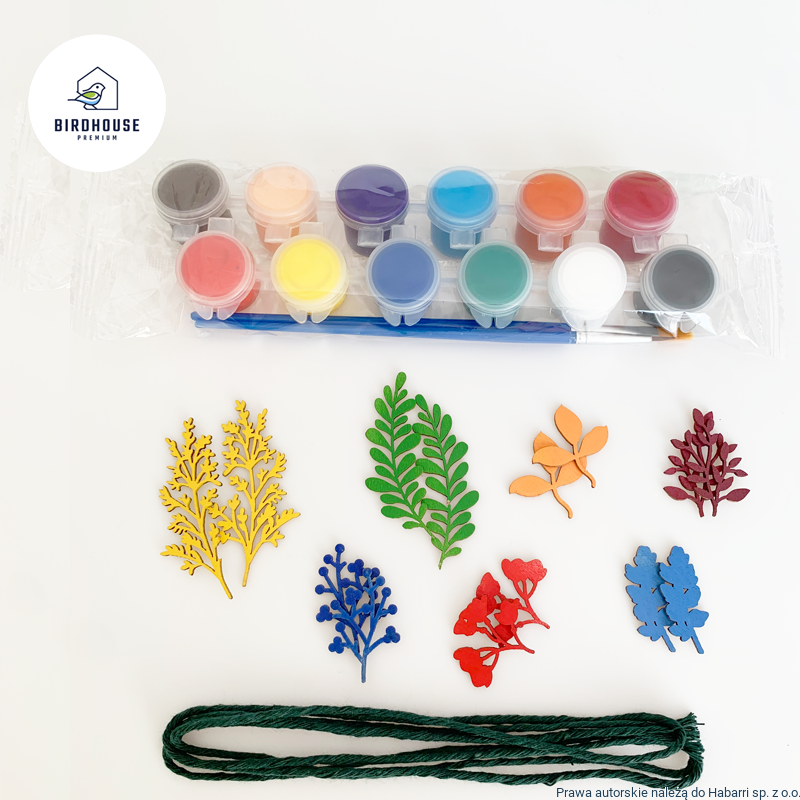 - zestaw do ozdobienia budki - farbki (12 kolorów), pędzelki (2 szt - wąska i szeroka końcówka), elementy drewniane - scrapki: rośliny - 7 rodzajów po 2 szt, wymiary; największa 6 cm wys/2 cm szer, najmniejsza 3 cm wys/1,5 cm szer, sznurek bawełniany w kolorze ciemno-zielonym (2 szt x dł 1 m)