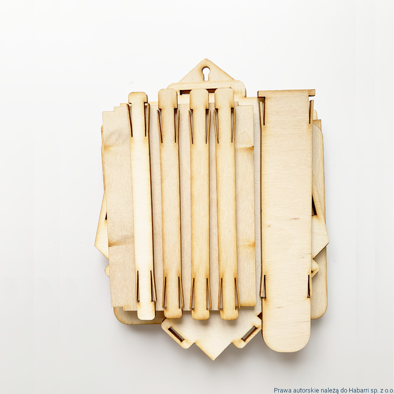 - Materiały: drewno (sklejka brzozowa, 3 mm), sznurek