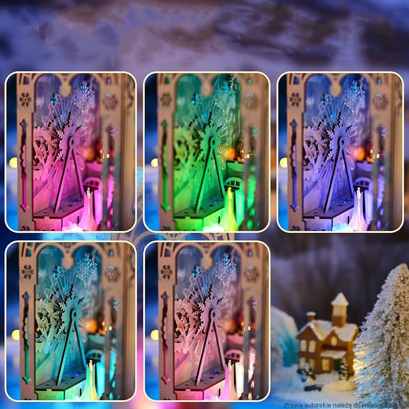 - Element rotacyjny (pokrętło od frontu domku), pięć rodzajów oświetlenia