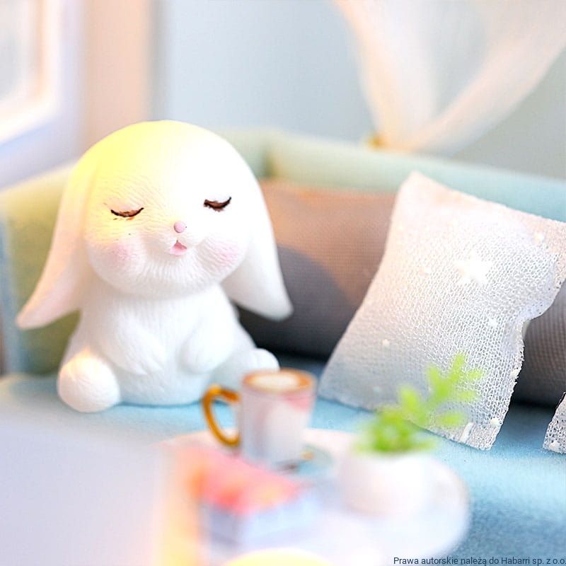 - Domek w wyposażeniu posiada figurkę białego króliczka