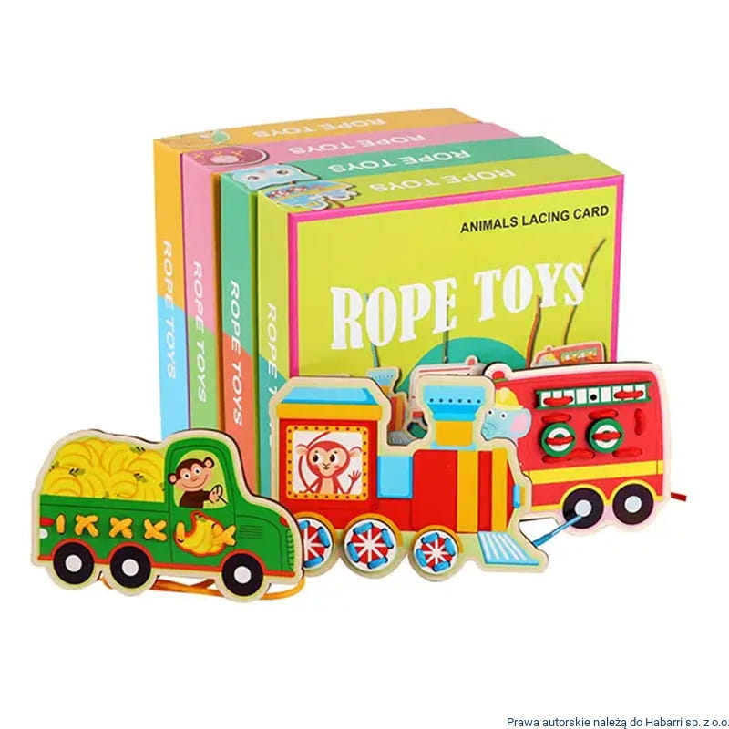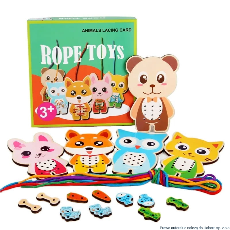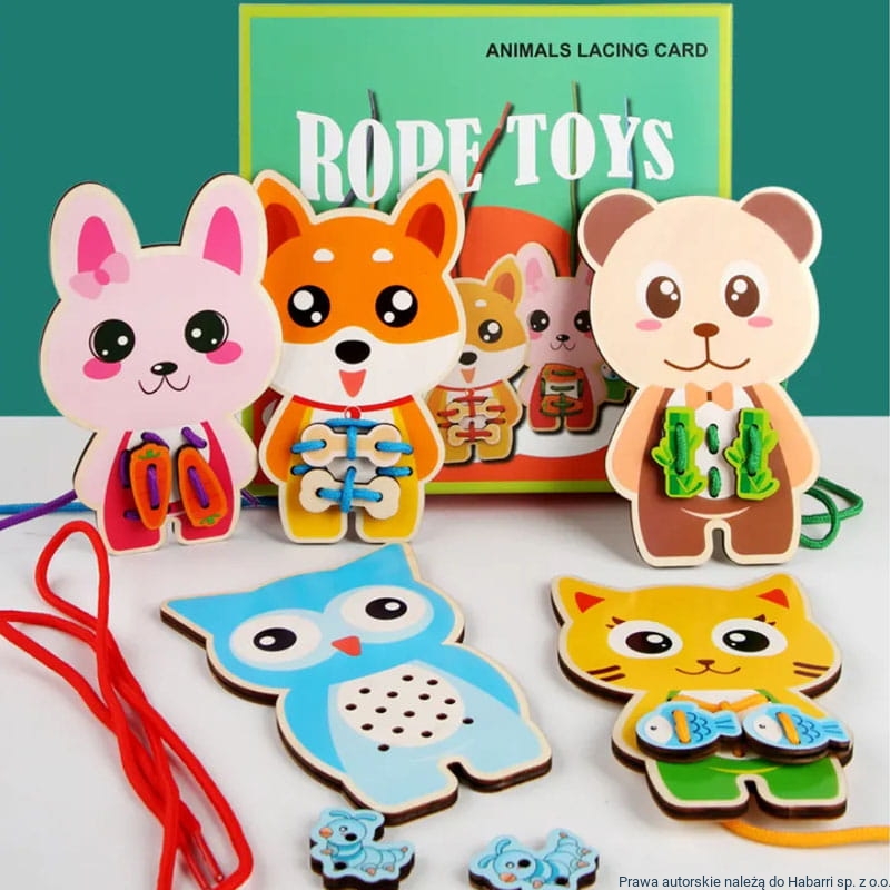 - drewniane puzzle Montessori typu Rope toy - Zwierzątka. Popularne sznurówki oraz specjalnie laserowo docięte elementy w różnych kształatach i kolorach, które uczą dziecko sprawności w wiązaniu