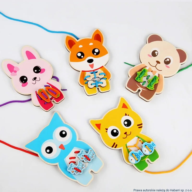 Puzzle drewniane Montessori - sznurówki - nauka wiązania Zwierzątka