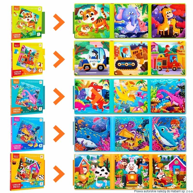 Puzzle w formie rozkładanej książeczki świetnie sprawdzą się zarówno w domu, jak i w podróży. Rosnący poziom trudności ułatwia dobór do umiejętności dziecka. Doskonała nauka przez zabawę.