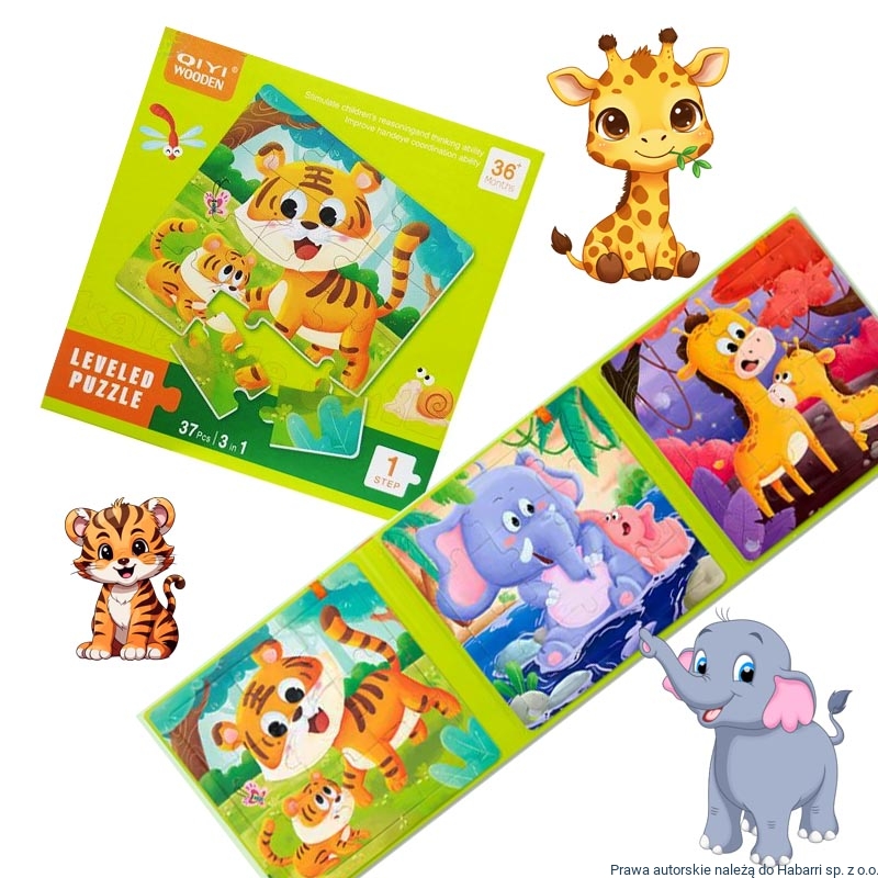 Puzzle edukacyjne - Poziom 1 - Tygrys, Słoń, Żyrafa