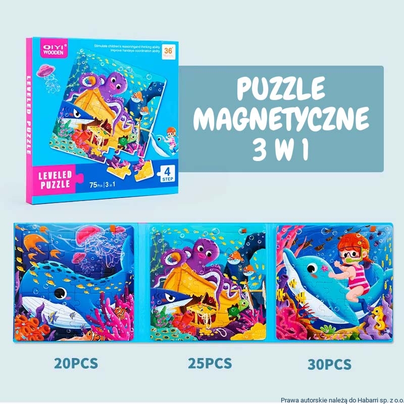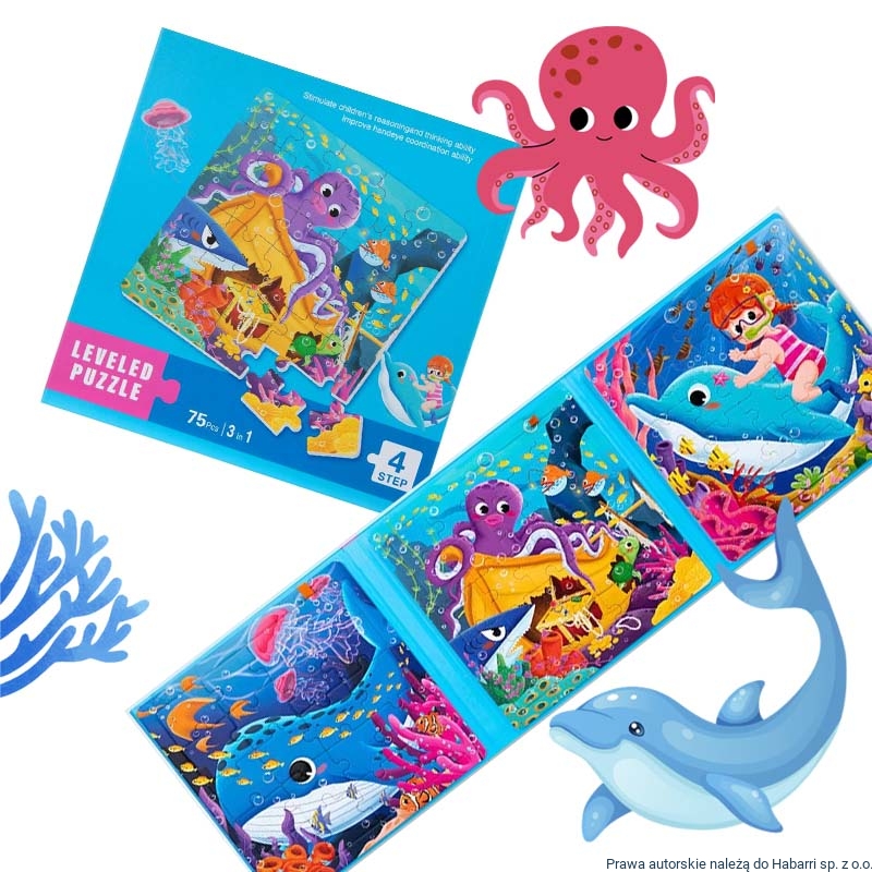 - książeczka posiada sztywne okładki, po otwarciu na każdej ze stron znajduje się obrazek przedstawiający zwierzątka oceanu, puzzle umieszcza się na stronach książeczki - po jej otwarciu - w oparciu o nadrukowany rysunek (w jasnych kolorach)