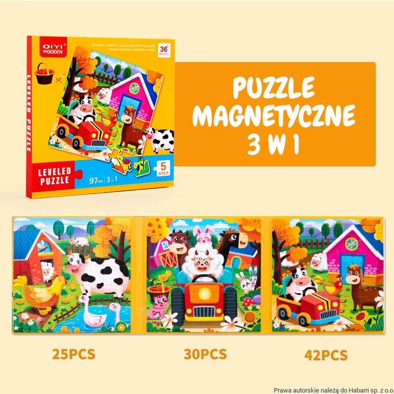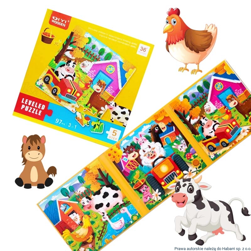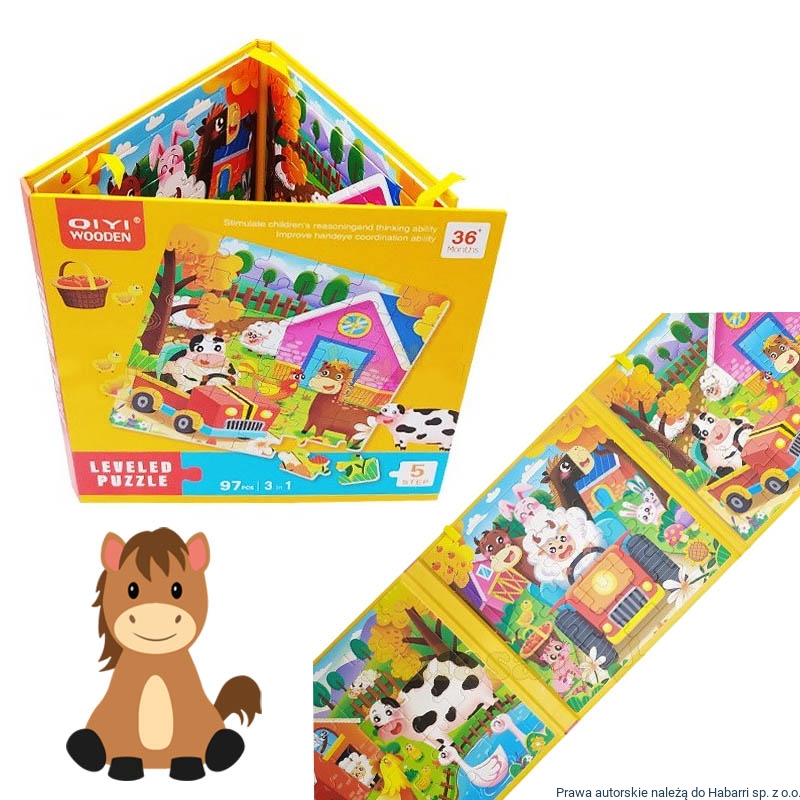 - książeczka posiada sztywne okładki, po otwarciu na każdej ze stron znajduje się obrazek przedstawiający zwierzątka na farmie, puzzle umieszcza się na stronach książeczki - po jej otwarciu - w oparciu o nadrukowany rysunek (w jasnych kolorach)