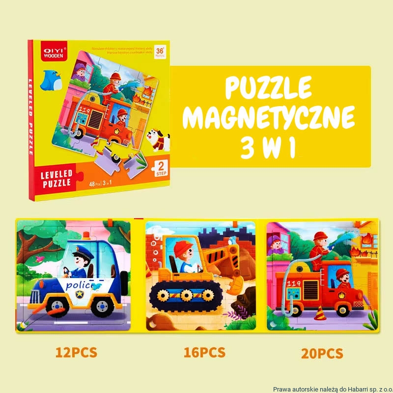 - książeczka posiada sztywne okładki, po otwarciu na każdej ze stron znajduje się obrazek przedstawiający pojazdy (policja, koparka, straż), puzzle umieszcza się na stronach książeczki- po jej otwarciu - w oparciu o nadrukowany rysunek (w jasnych kolorach)