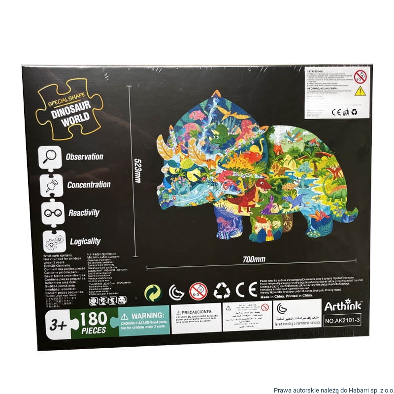 - bardzo dobrej jakości puzzle edukacyjne - po złożeniu przedstawiają kształt dinozaura - Triceratopsa