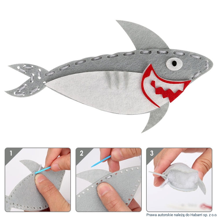 - zawartość opakowania: elementy do zszycia, plastikowa igła (6 szt), plastikowe nożyczki, kolorowe nici (6 szt), elementy plastikowe oraz/lub filcowe do naklejenia, sztuczne wypełnienie, klej (sztuczne wypełnienie można zastąpić watą kosmetyczną)