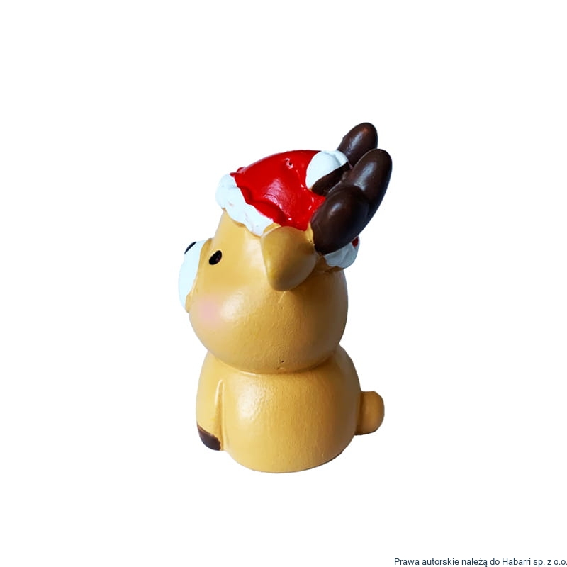 Świąteczny reniferek - siedzący - w kolorze jasno brązowym, świąteczna czapka czerwona z białym obszyciem.