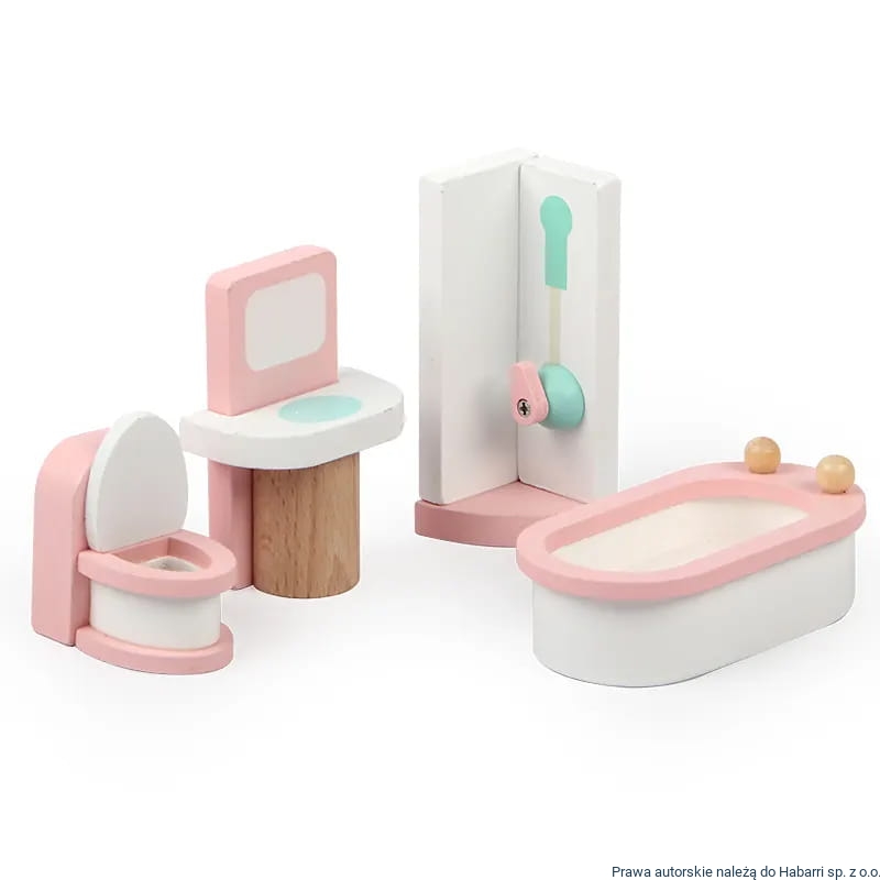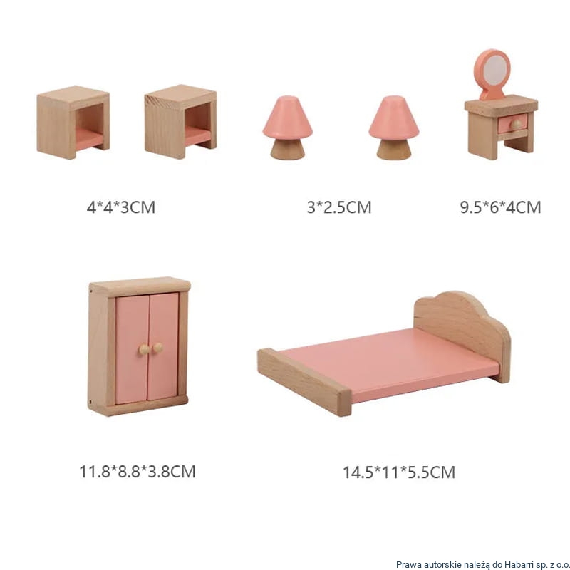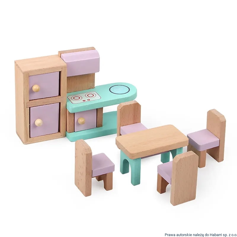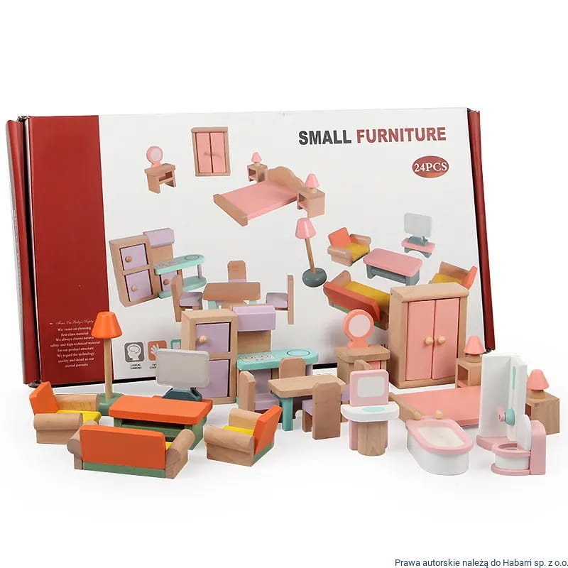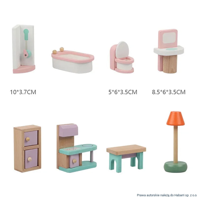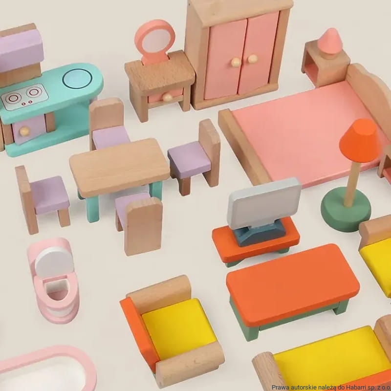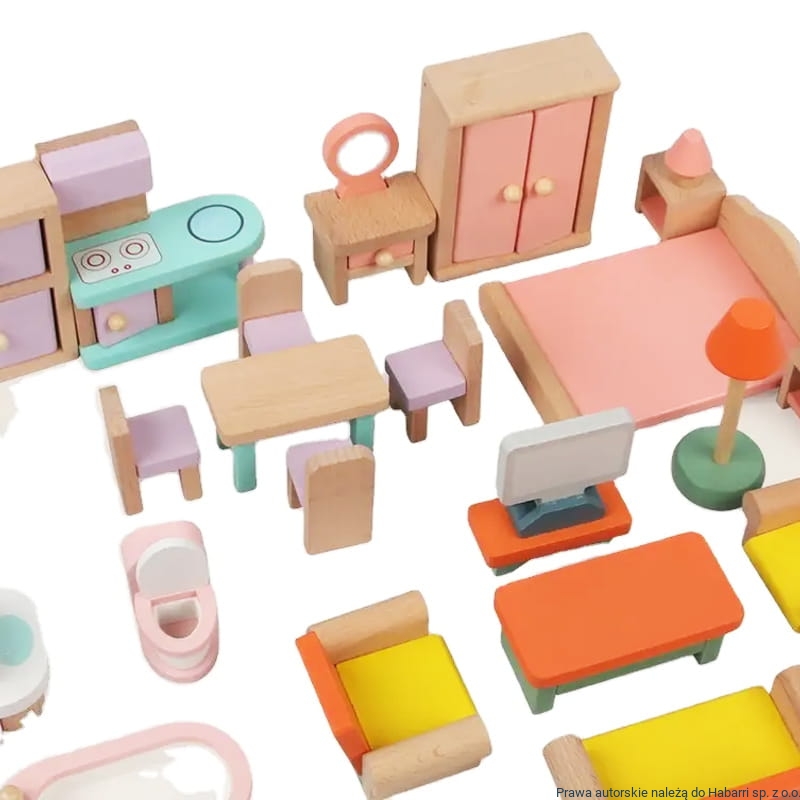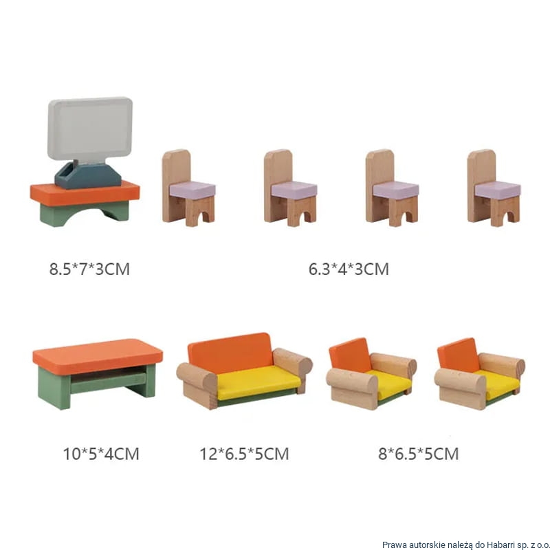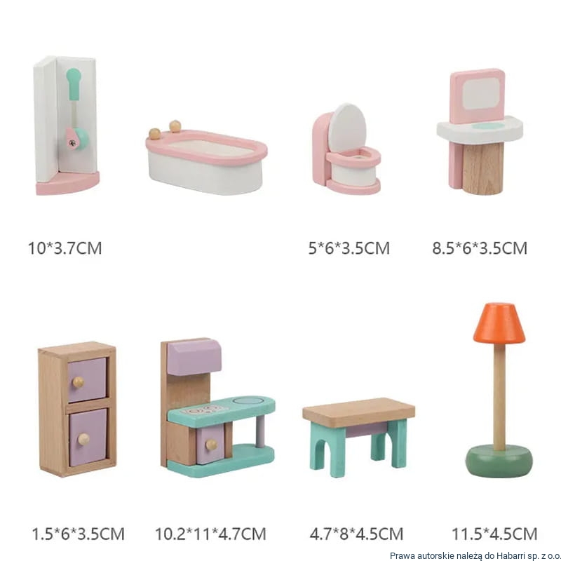- mebelki drewniane do domu dla lalek - zestaw zawiera elementy do: salonu, sypialni, łazienki, kuchni