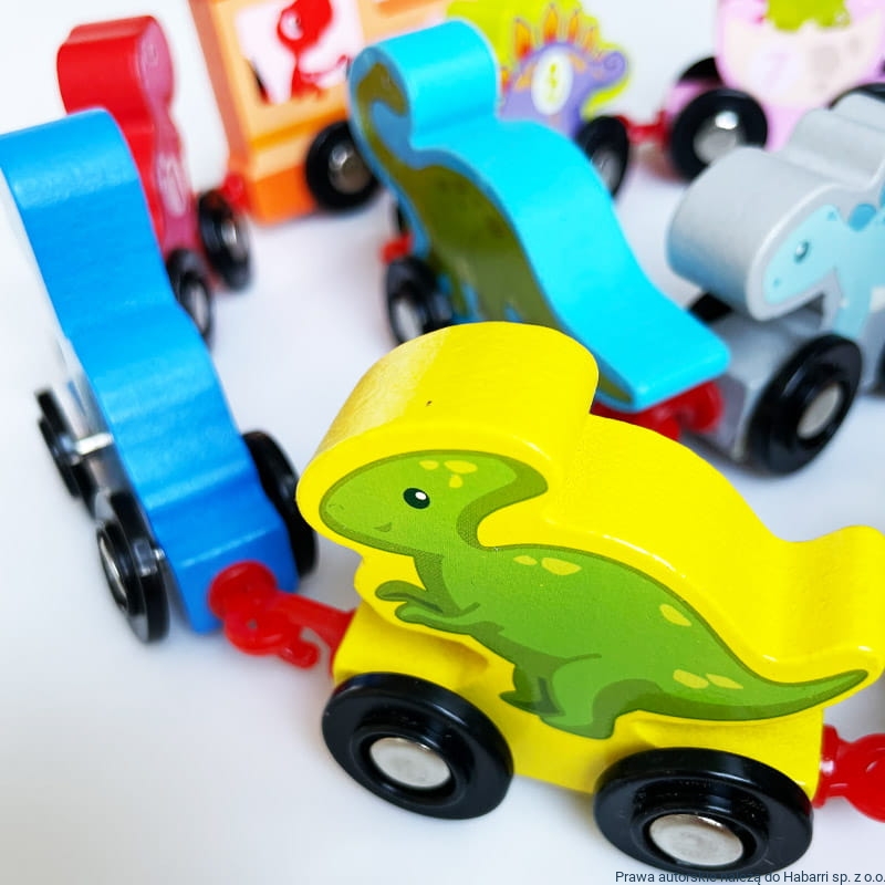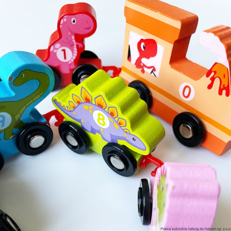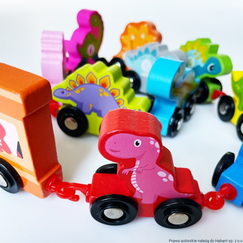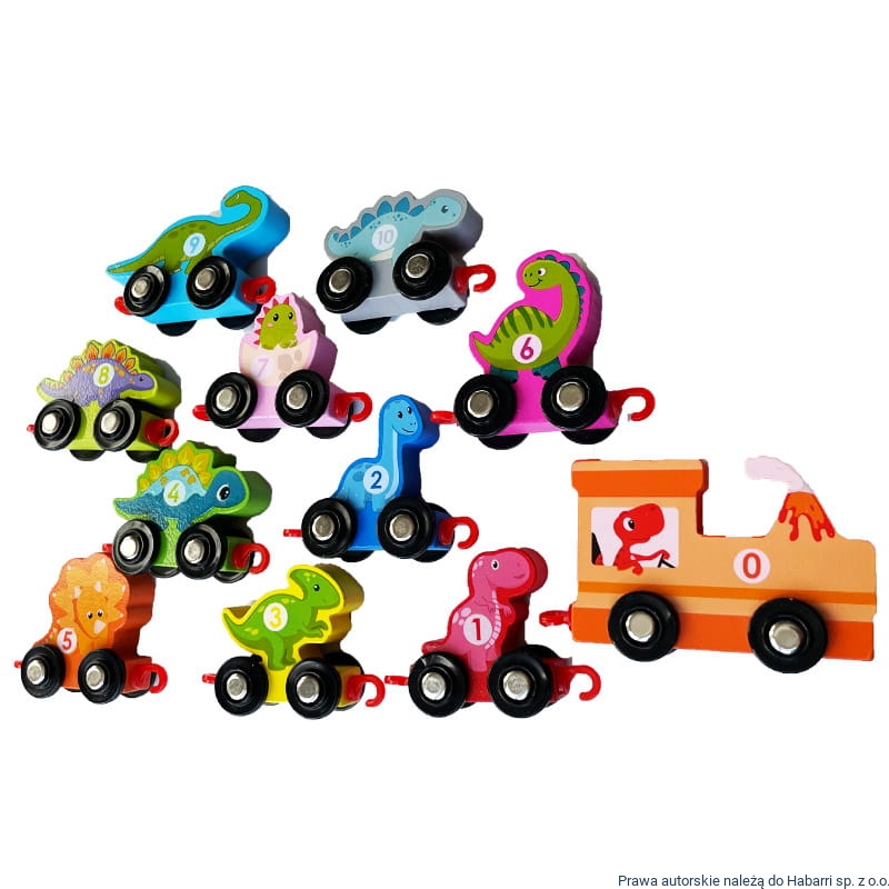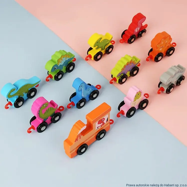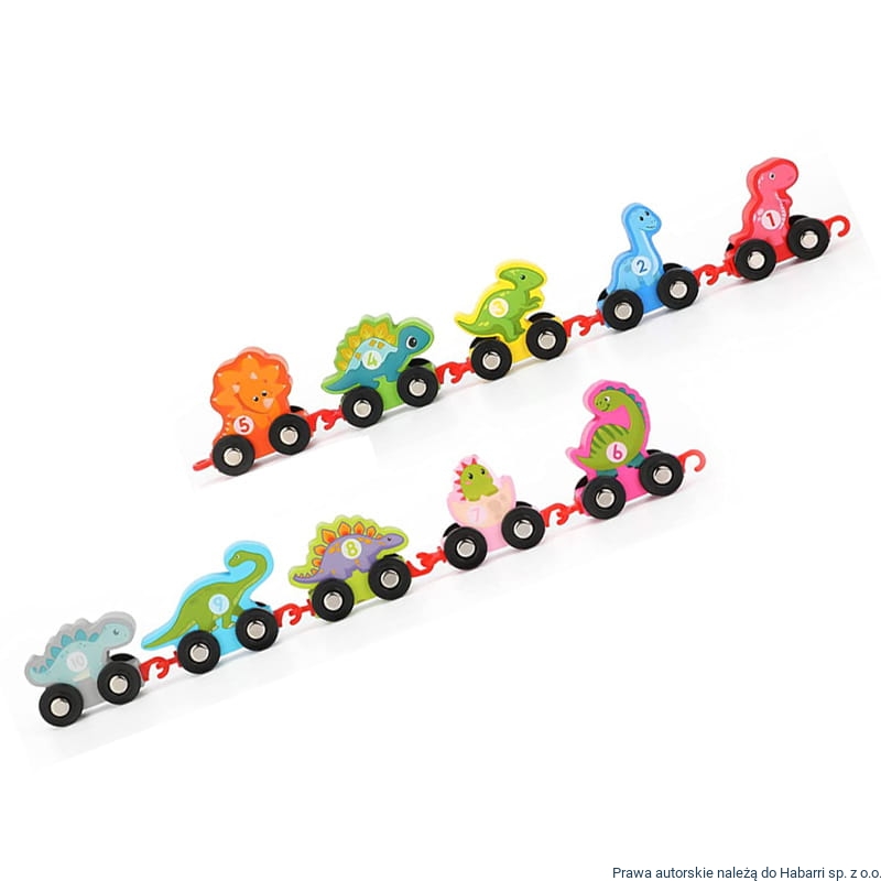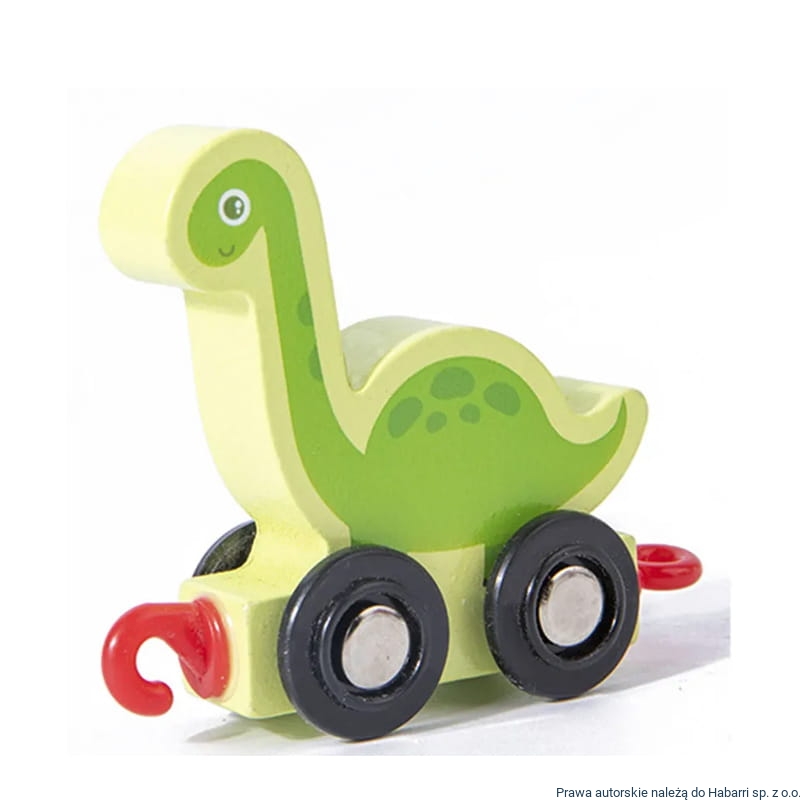 - wagoniki na kółkach, w formie dinozaurów, połączone czerwonym haczykiem