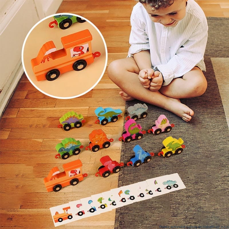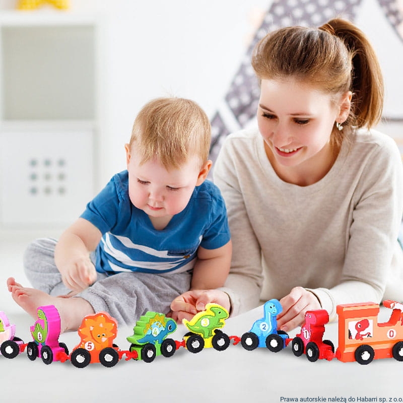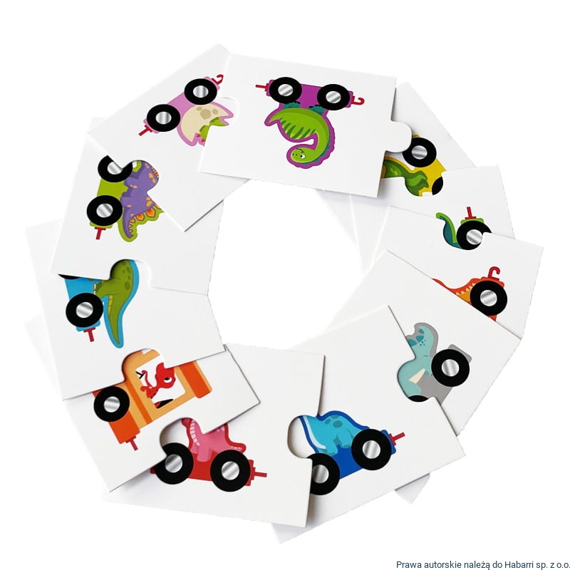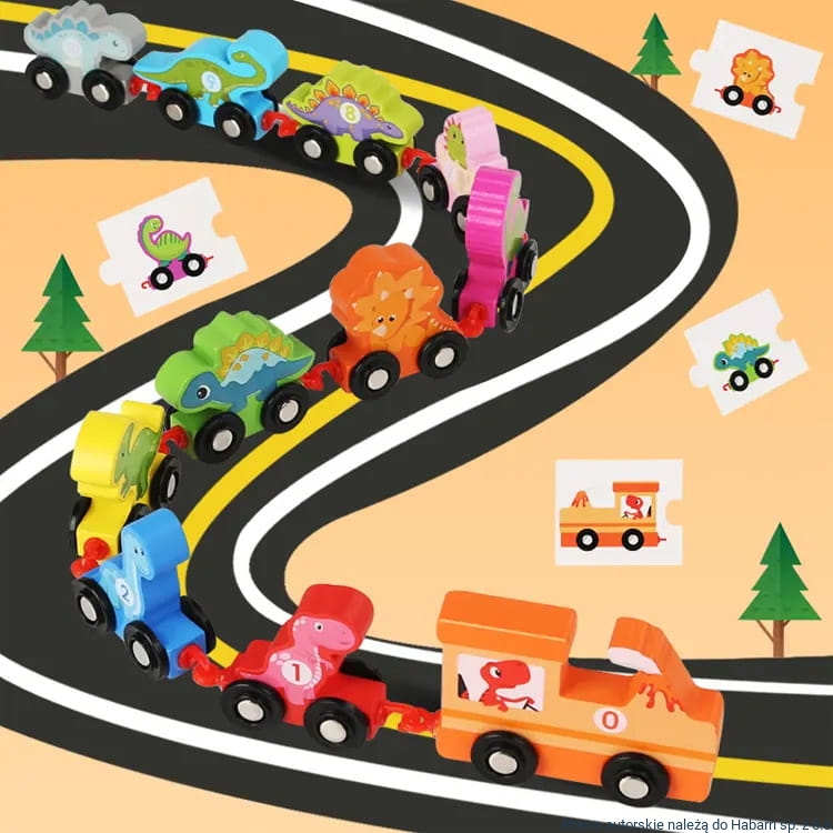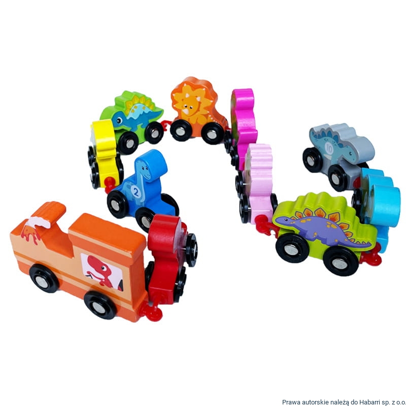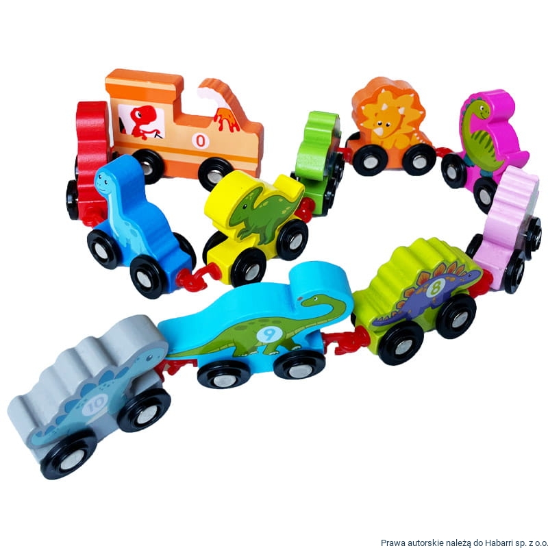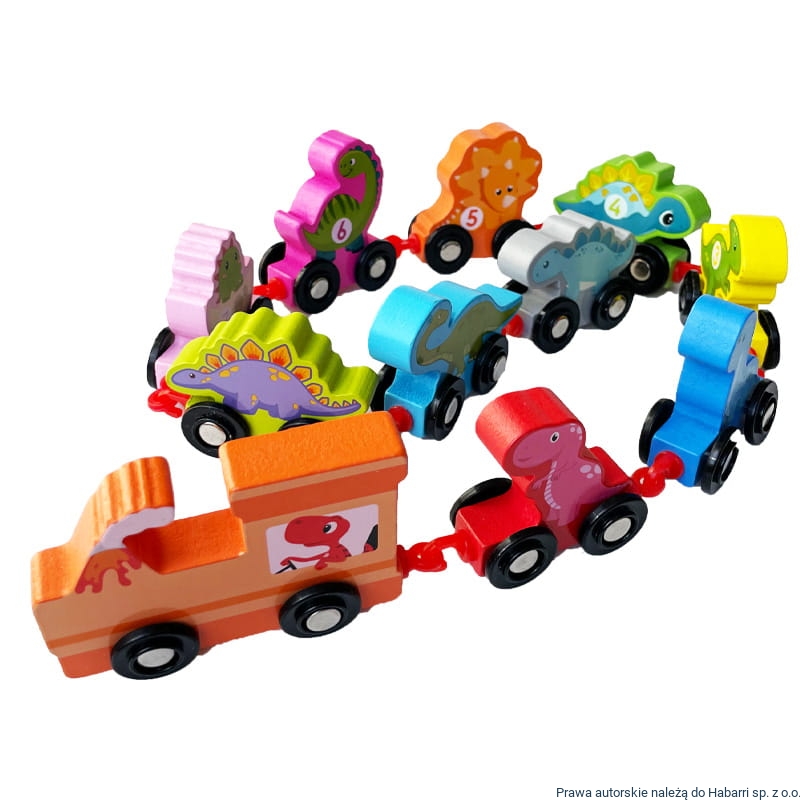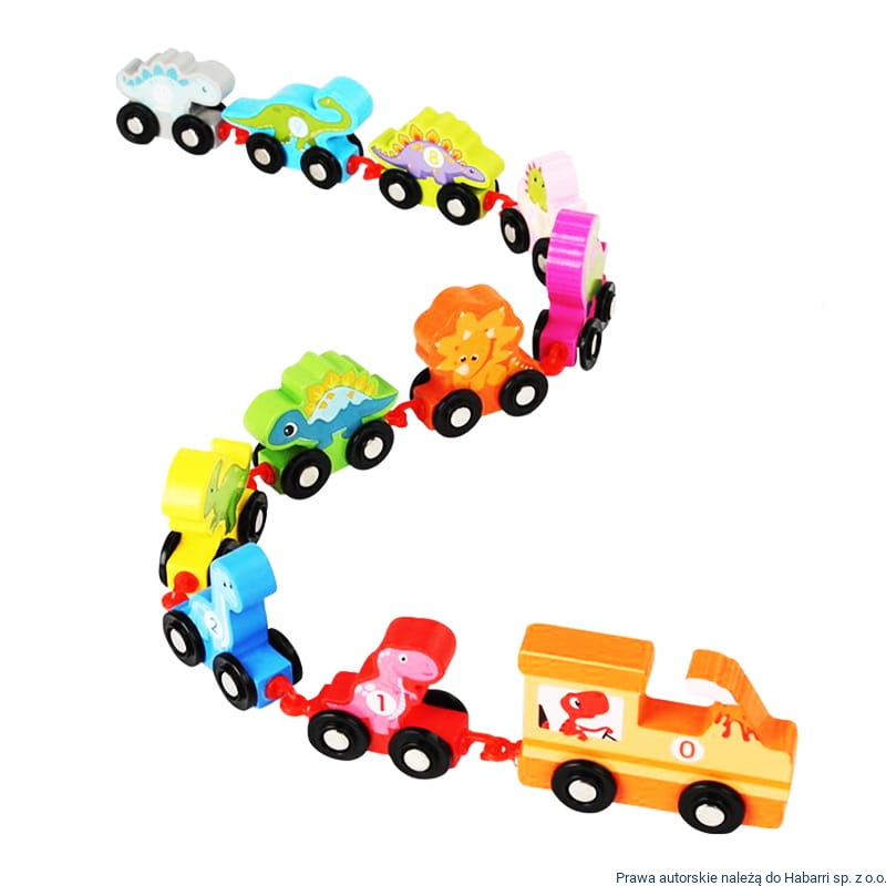 - wagoniki na kółkach, w formie dinozaurów, połączone czerwonym haczykiem