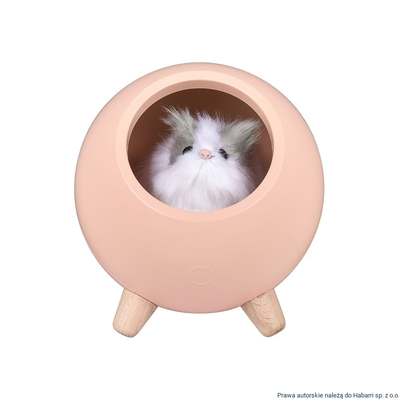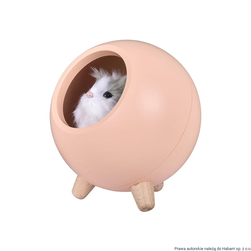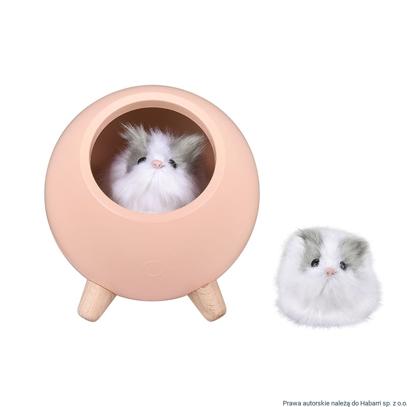 Różowy nosek, czarne oczka i szare, szpiczaste uszka wystające z lampki nocnej dla dzieci to znak firmowy tego miłego zwierzaczka. Biały chomik z szarymi uszkami, bo o nim mowa, mieszka w morelowej lampce. Jeśli zachodzi taka potrzeba, może ją opuścić. Musi mu w tym jednak pomóc dziewczynka lub chłopczyk, którzy się nim opiekują. Można go wówczas przytulić lub pogłaskać. Ten mały chomik umili czas dziecku w ciągu dnia oraz będzie strzegł go w czasie snu. Choć jego futerko jest sztuczne i nie trzeba po nim sprzątać, to jednak jest miły i przyjemny w dotyku.