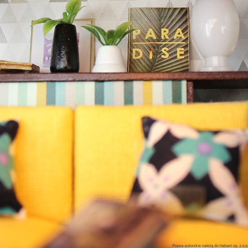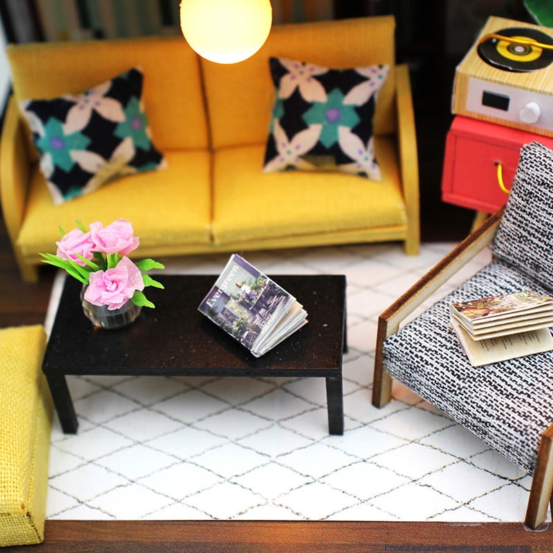 Mieszkanko ma zatem dwie kondygnacje. Na pierwszej zlokalizowany jest salon. W salonie znajduje się zestaw wypoczynkowy złożony z miniaturowych mebelków – jasnej drewnianej ławy, kanarkowej pufy i kanapy w takim samym kolorze oraz znalezionego zapewne na jakimś pchlim targu fotela, z obiciem w kolorze szarego melanżu. Za kanapą znalazło się miejsce na szafkę na najpotrzebniejsze rzeczy oraz książki. Jednak najważniejszym meblem w tym pokoju jest jasnoróżowa szafka ze złotym uchwytem służąca za podstawę do gramofonu. Wiadomo, że jeśli ktoś chce słuchać muzyki w najlepszej jakości i w najlepszym stylu, to wybiera płyty winylowe! Salon zdobią również rozmaite rośliny, pamiątki z podróży do różnych krajów.