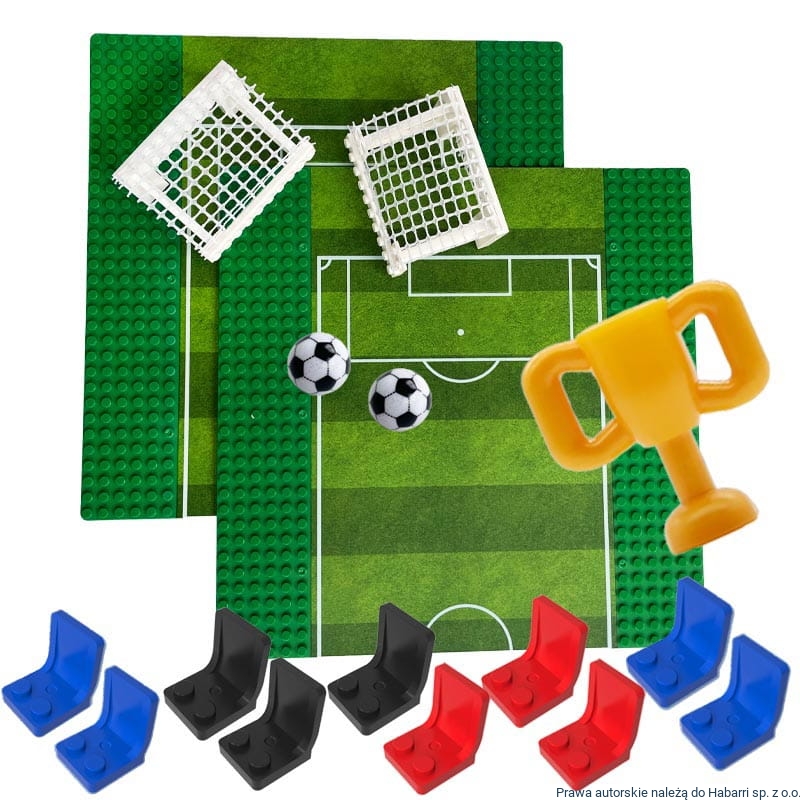 - ilość elementów: plansza - 2 szt, bramka - 2 szt (każda 8 el.), piłka - 2 szt, siatka do bramki - 2 szt, krzesełka - 10 szt, puchar piłkarski - 1 szt