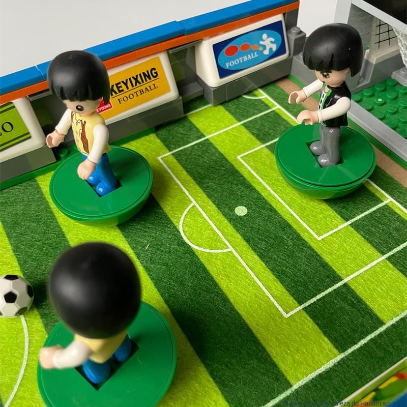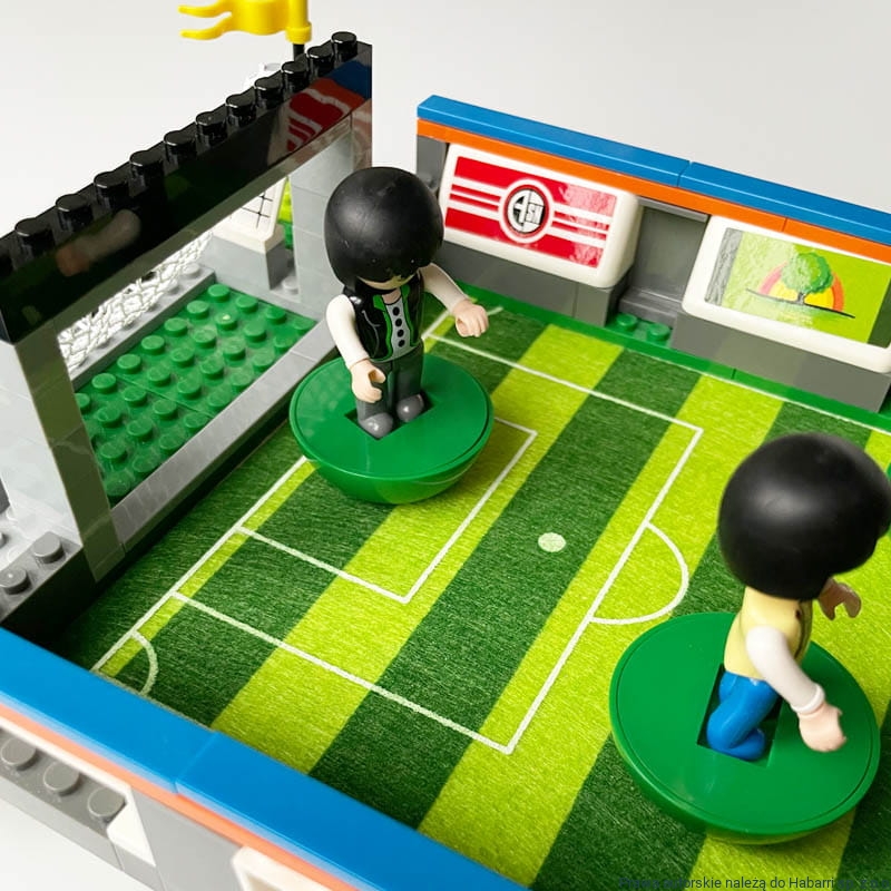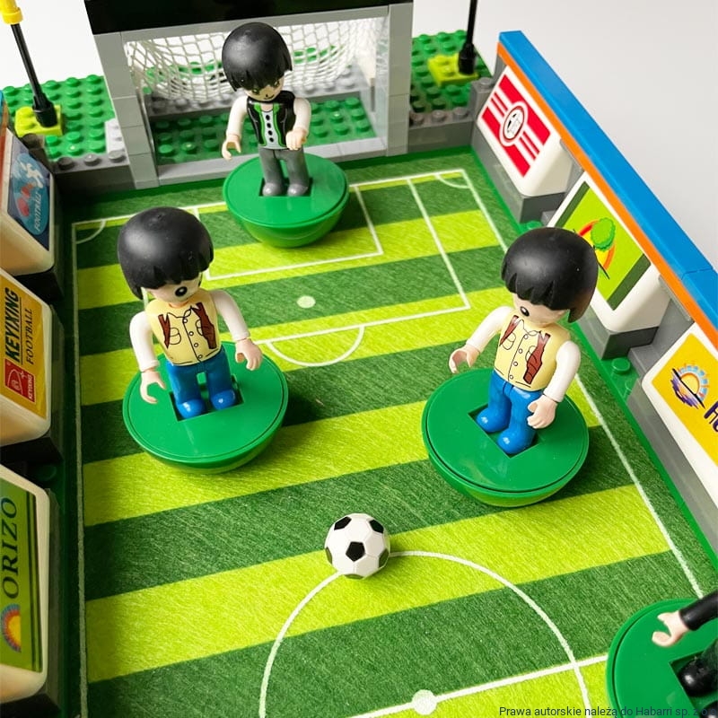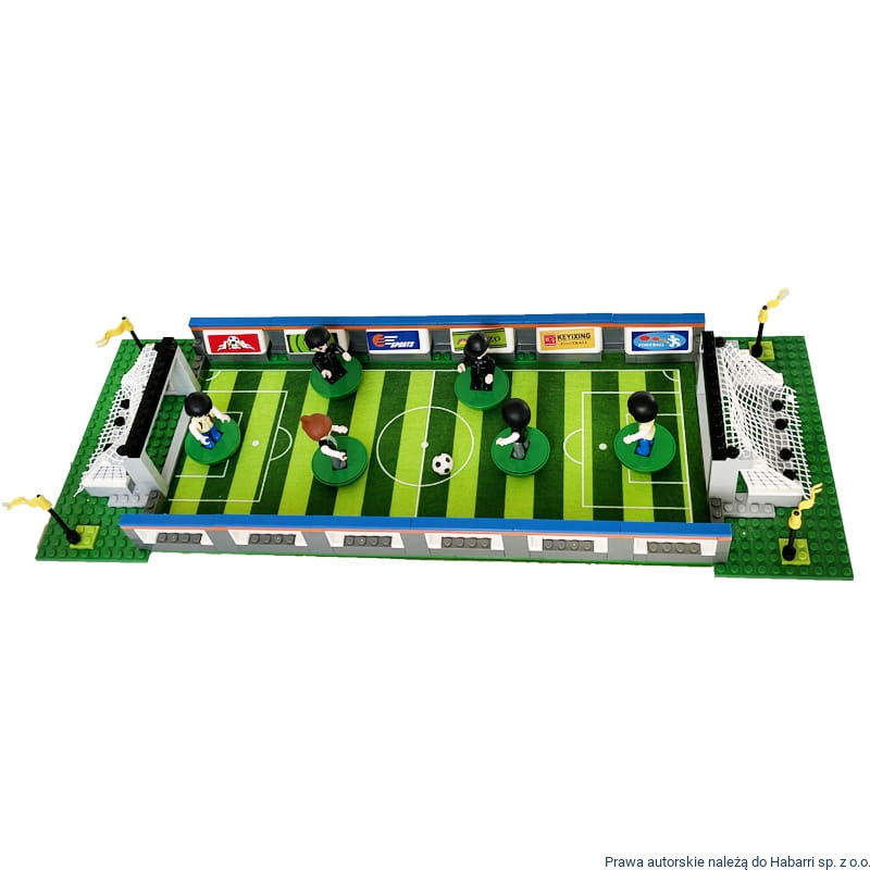 - trybuny i bramki z klocków, zielone płyty konstrukcyjne pod trybunami i bramkami