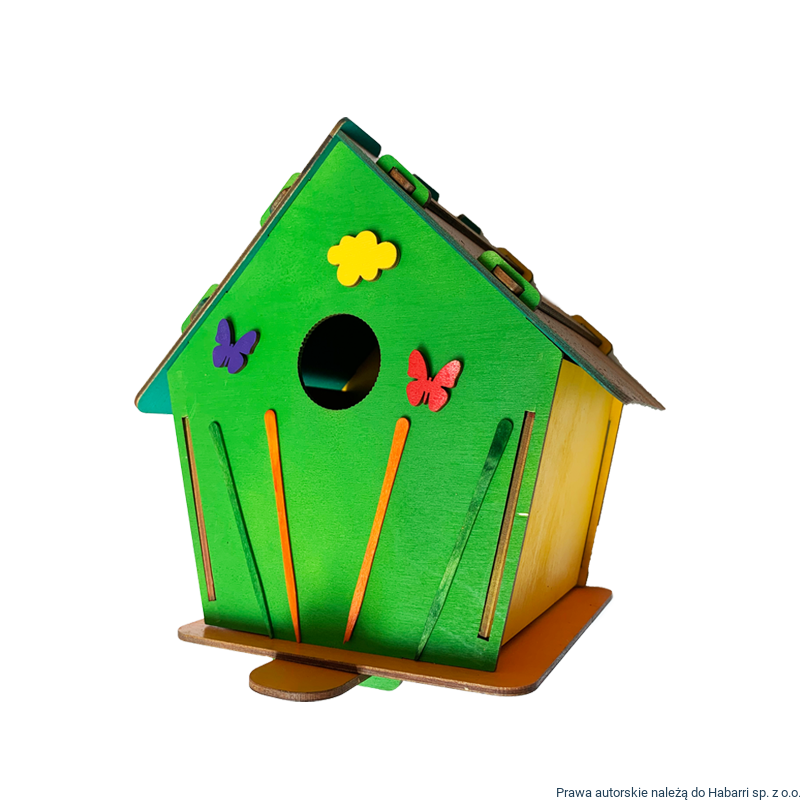 Zachęcamy każde dziecko do stworzenia swojej własnej koncepcji domku dla ptaków. Proponowany zestaw można wykorzystać na domek niemalowany (kolor jasno beżowy sklejki) lub dowolnie pomalowany.
